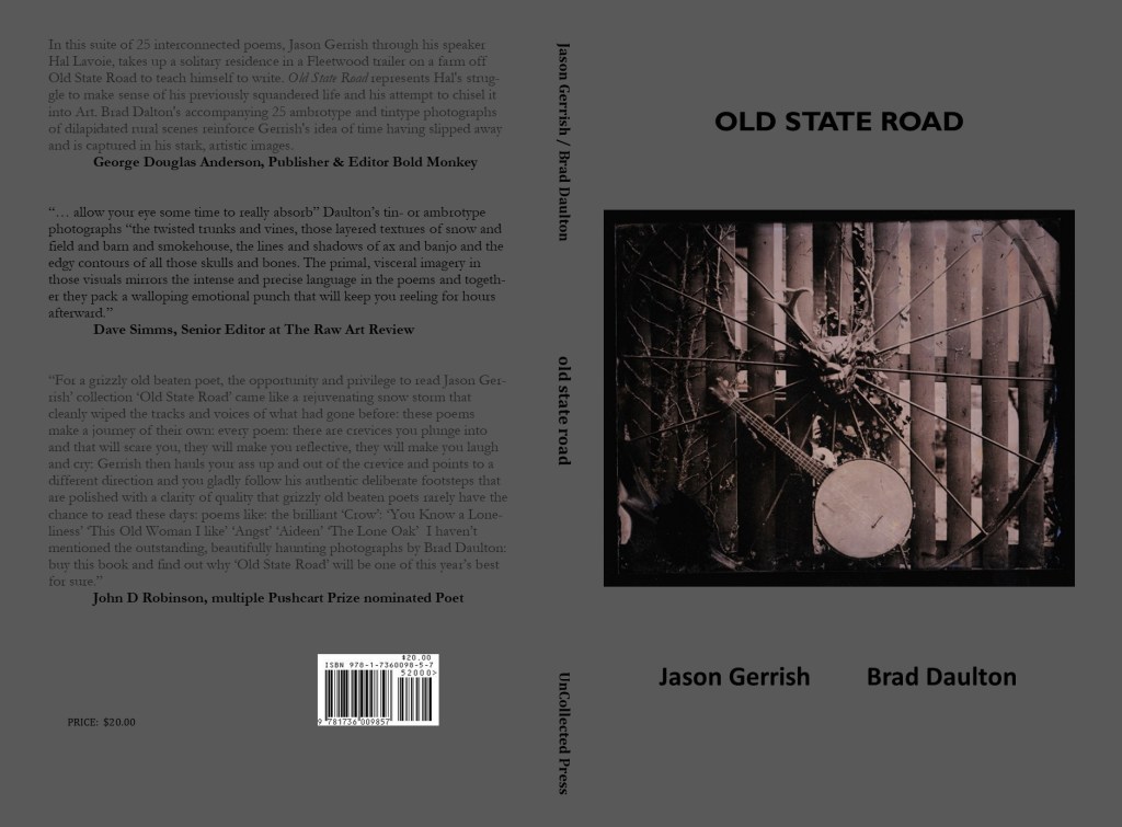 I am woefully behind in announcing Jason Gerrish’s exceptional and peerless book OLD STATE ROAD. I am so far behind, because I have been struggling mightily to do it justice. I have felt strongly that this book requires an announcement that approximates the elegance, refinement, and uncompromising commitment to as pure and unadulterated an artistic aesthetic as I have come across in my 40+ years in publishing. This is just such a good book and on so many levels. The poems are the product of an artist, two artists – poet and photographer – who clearly know how to coerce beauty into words and images with patience and passion and finely-honed tradecraft.