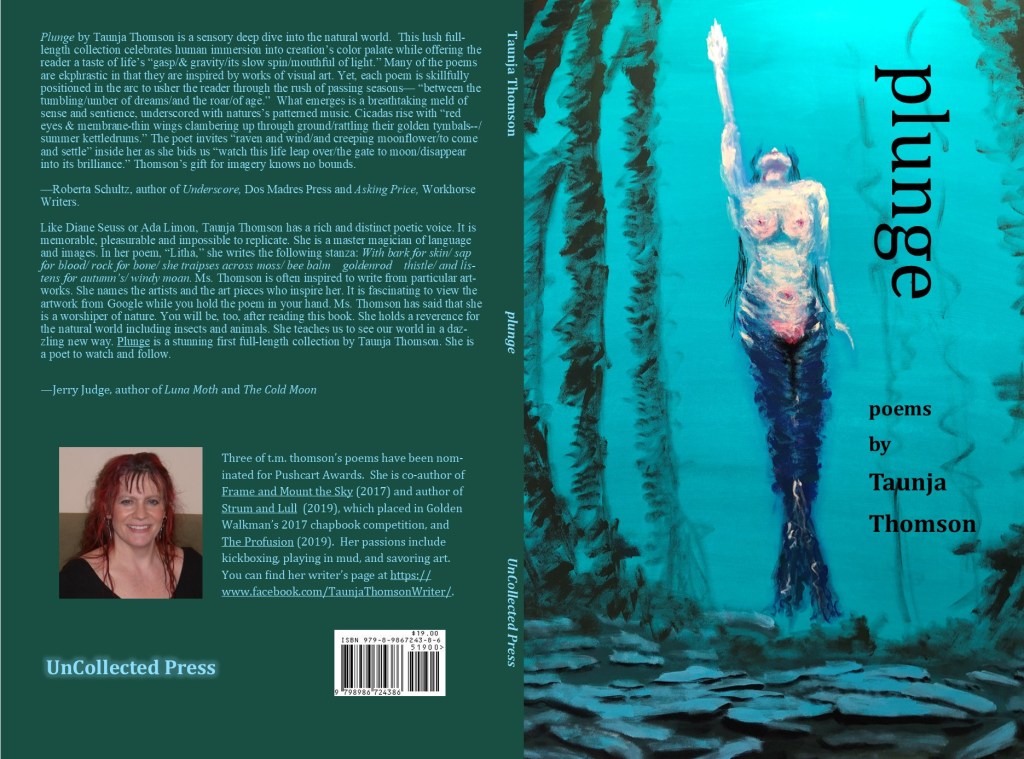 Plunge by Taunja Thomson is a sensory deep dive into the natural world. This lush full-length collection celebrates human immersion into creation’s color palate while offering the reader a taste of life’s “gasp/& gravity/its slow spin/mouthful of light.” Many of the poems are ekphrastic in that they are inspired by works of visual art. Yet, each poem is skillfully positioned in the arc to usher the reader through the rush of passing seasons— “between the tumbling/umber of dreams/and the roar/of age.” What emerges is a breathtaking meld of sense and sentience, underscored with natures’s patterned music. Cicadas rise with “red eyes & membrane-thin wings clambering up through ground/rattling their golden tymbals–/summer kettledrums.” The poet invites “raven and wind/and creeping moonflower/to come and settle” inside her as she bids us “watch this life leap over/the gate to moon/disappear into its brilliance.” Thomson’s gift for imagery knows no bounds.